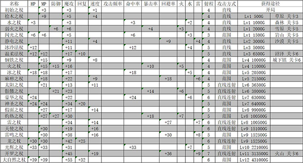 骷髅之杖:唯一具备暴击加成的直线连射法杖,价格实惠、属性均衡,是前期首选;
