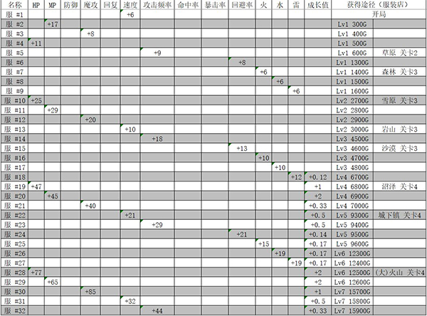 衣服方面(所有服装均不提供防御、回复、命中率或暴击率加成,仅部分统计成长值):推荐选择服#30,因其在所有服装中魔攻加成最高。