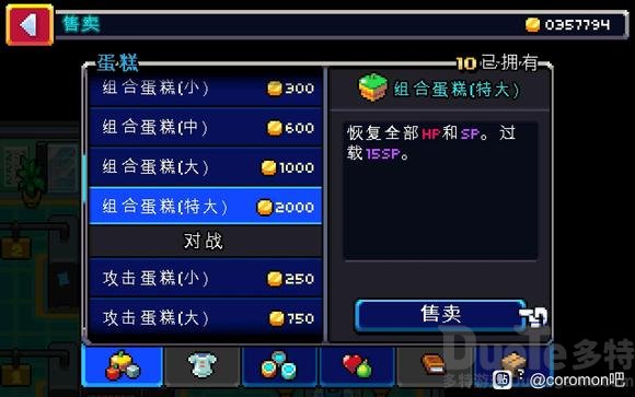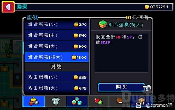 接着前往道具商店,与老板对话,以每个1800金币的价格购买99个“组合蛋糕(特大)”。此时老板会惊讶地称你为“大客户”。