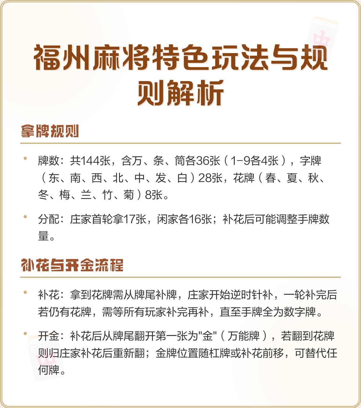 福州麻将特色玩法与规则解析福州麻将一共144张牌,万、条、筒各36张(1到9各4张),字牌28张(东、南、西、北、中、发、白),花牌8张(春、夏、秋、冬、梅、兰、竹、菊)。这种玩法靠拿牌、补花、开金等独特规则和多样的胡牌类型出名,在当地挺受欢迎。