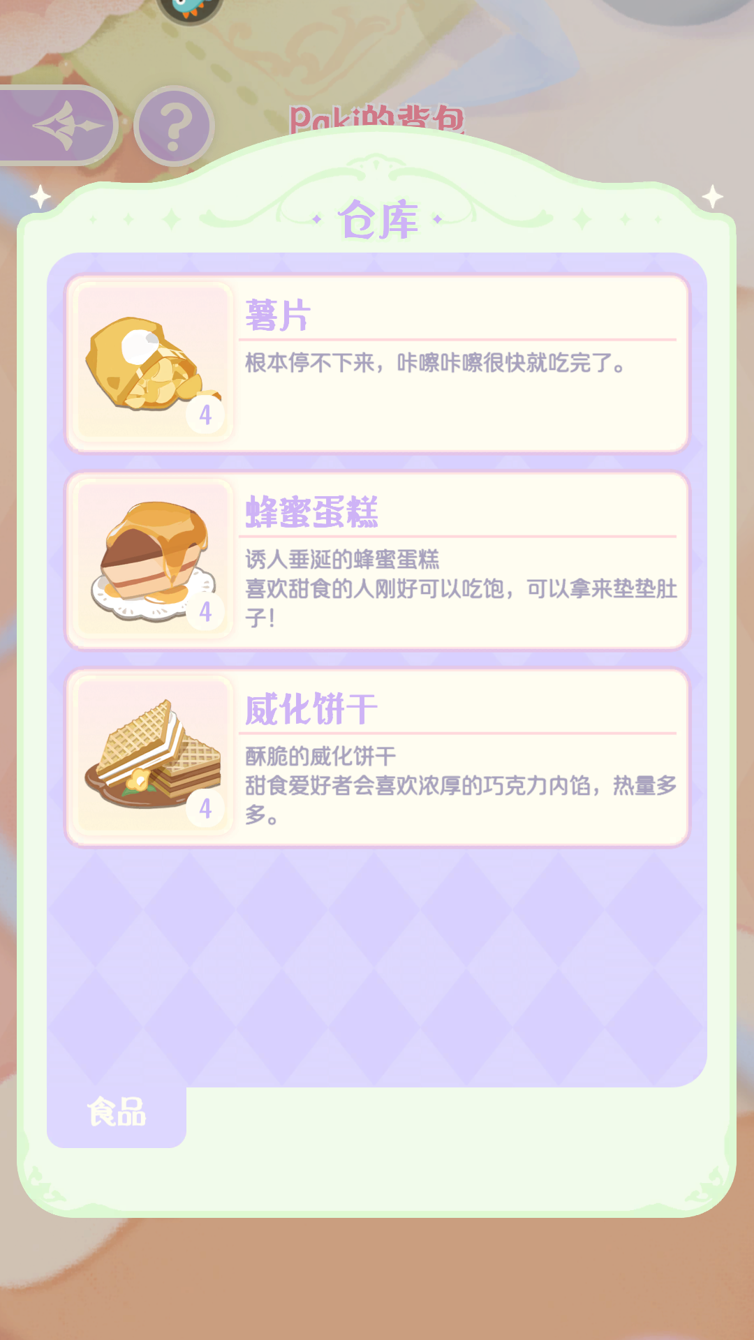 Paki对食物不挑,薯片、南瓜派、饼干、蛋挞、蛋糕等都能触发出门,水较少使用,通常留给UNO。