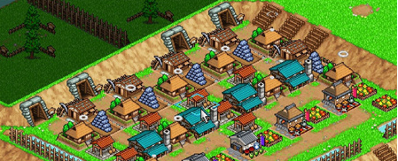 此版本月收入最低可达6000金币。不过,该方案仍存在明显短板:五名矿工却仅有四个矿场工作位,导致人力浪费;同时后方产能难以支撑六个店铺的消耗。此外,景观建筑与住宅也进行了升级,最终调整为下图所示布局: