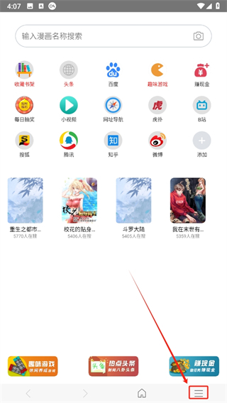 打开免费漫画阅站后,点击右下角三条杠图标,如图所示;
