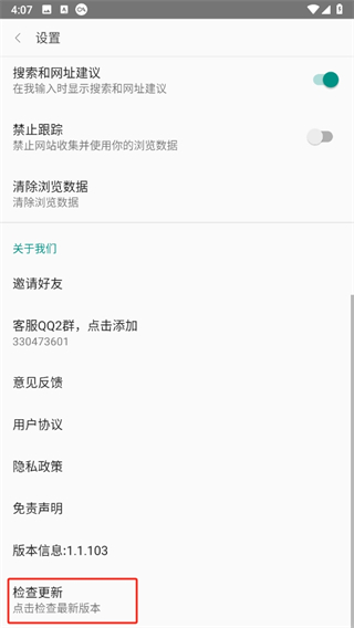 进入设置页面后,最底部的【检查更新】选项请勿点击,这样就能确保软件版本始终如一。