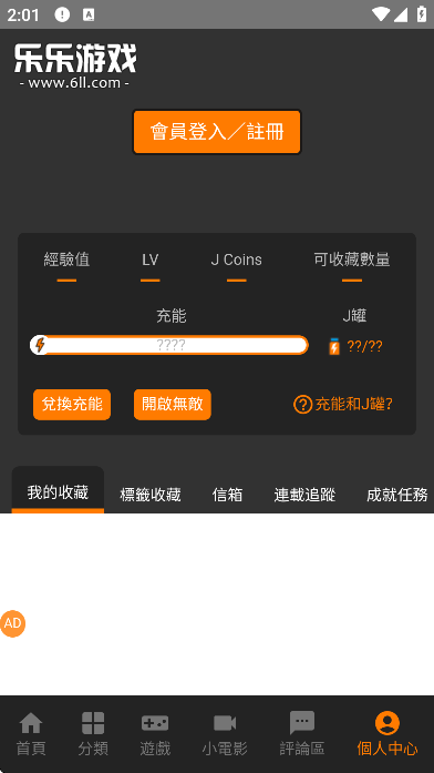 2、打开jmcomic后,点击右下角【我的】进入个人中心,再点击顶部的【会员登录/注册】选项。