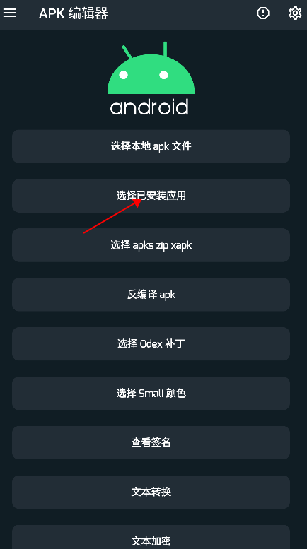 1、安装APK编辑器后,打开应用,点击“选择一个应用作为APK”;