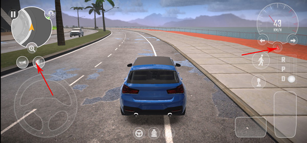4、屏幕下方箭头所指区域为车辆档位切换与手刹控制,助你在复杂路况中灵活应对;