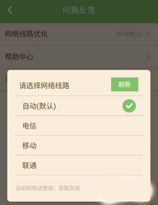 解决方法:进入“我的页面”,点击右上角齿轮图标进入“系统设置”,选择“问题反馈”,在“网络线路优化”中根据当前使用的运营商进行选择,完成后重新尝试连接即可。