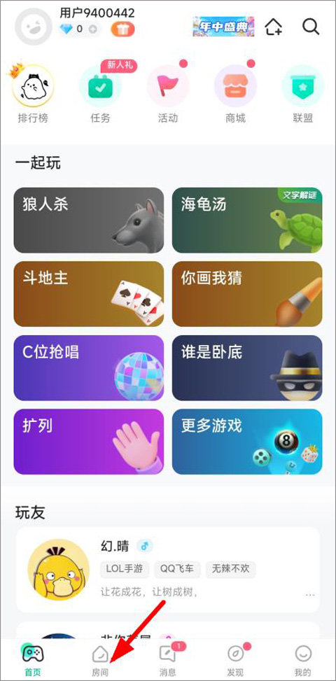 1、打开去玩APP并登录账号,进入主界面后,可与在线好友一起参与狼人杀、海龟汤、你画我猜等游戏,点击“房间”按钮;