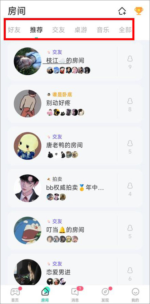 2、进入房间页面后,可根据兴趣选择推荐、交友、音乐等不同类别的房间;